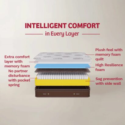 The Pocket Spring Mattress is engineered with individually wrapped springs that move independently to provide targeted support and superior comfort. This design minimizes motion transfer and adapts perfectly to body contours, making it ideal for couples. Combined with comfort foam layers, it delivers balanced support, pressure relief, and a luxurious sleeping experience.